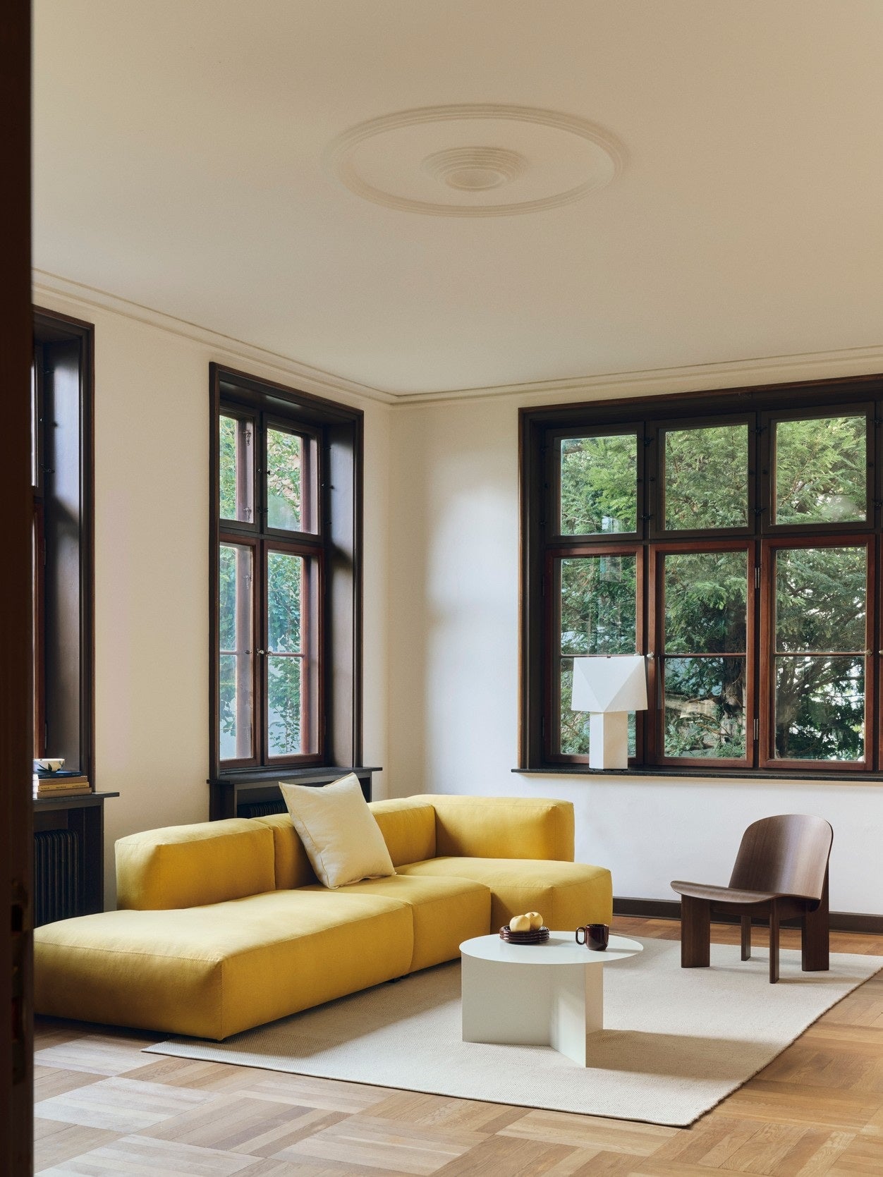 The diffused paper surface emits an ambient glow reminiscent of candlelight, adding warmth and atmosphere to its surroundings. Its minimal construction, paired with a discreet metal hook, make it lightweight and easy to move wherever light is needed. Available in two sizes, it adapts easily to most spaces – placed on tables, shelves, and windowsills, or as a floor-standing lamp in any room.